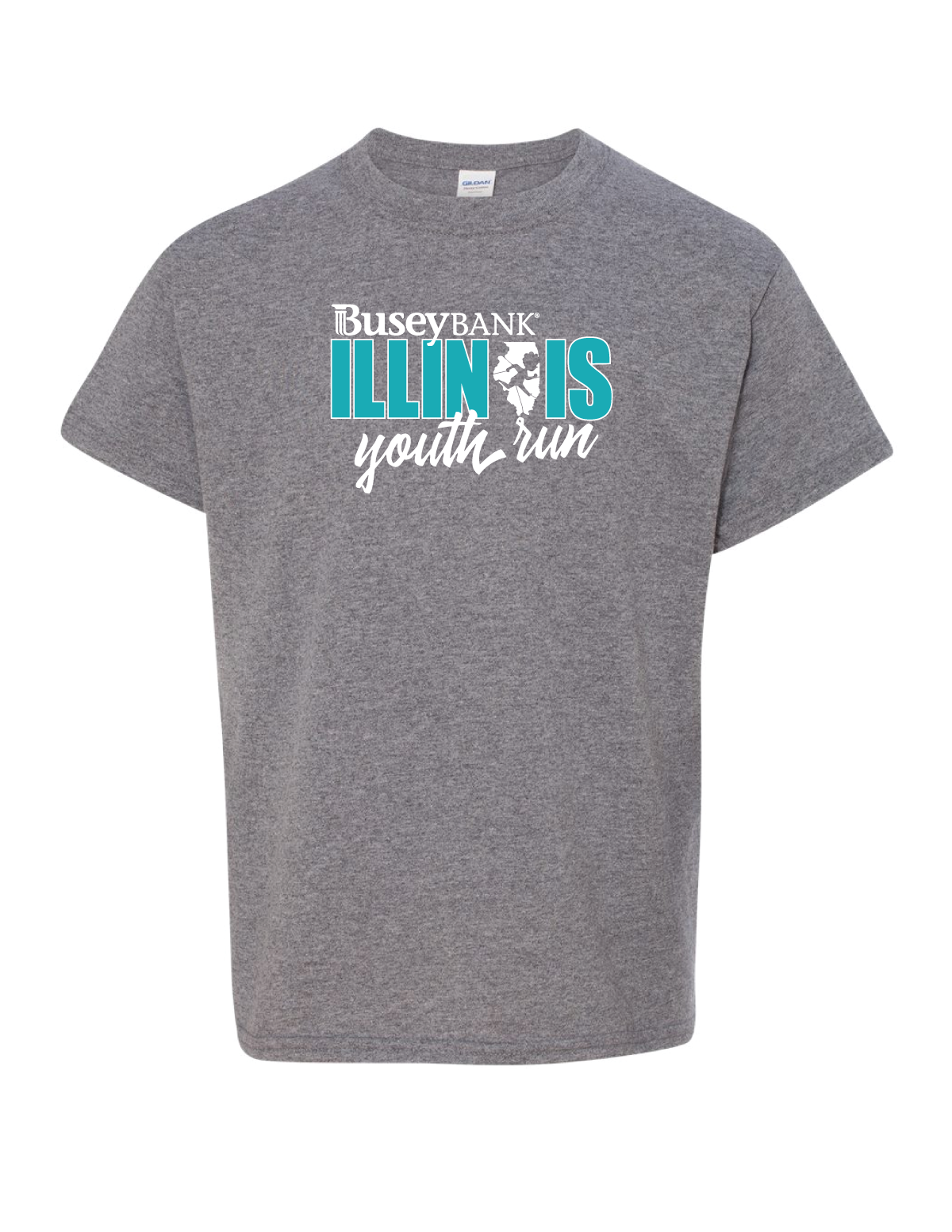 Youth Run entrants receive a drawstring backpack with cool race swag and other goodies from Busey Bank, including a 100% cotton pre-shrunk commemorative T-shirt. The 2026 youth run shirt color is graphite heather. All finishers also receive a unique youth run medal.